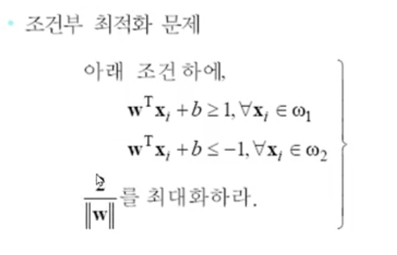 각각의 class에 있는 sample들과 만나게 되는 가장 처음 sample(support vector) 중에 여백(margin)을 가장 크게 하는 w를 찾는 문제