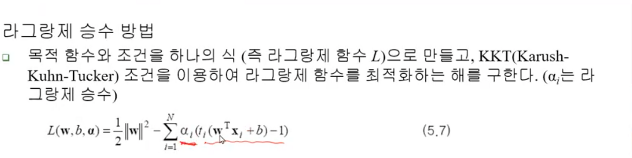 이때 w와 b가 사라져 라그랑제 a를 찾는 문제로 변하며, 특징 벡터 x가 내적 형태로 나타 비선형으로 확장 발판이 마련된다.